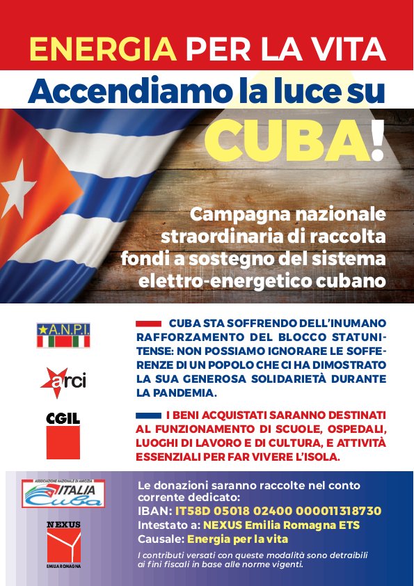 È giunto il momento di sostenere Cuba e di lanciare un programma straordinario di raccolta fondi a sostegno del sistema elettro–energetico per l’acquisto di prodotti, attrezzature e altri supporti tecnici per il funzionamento dei pannelli solari.